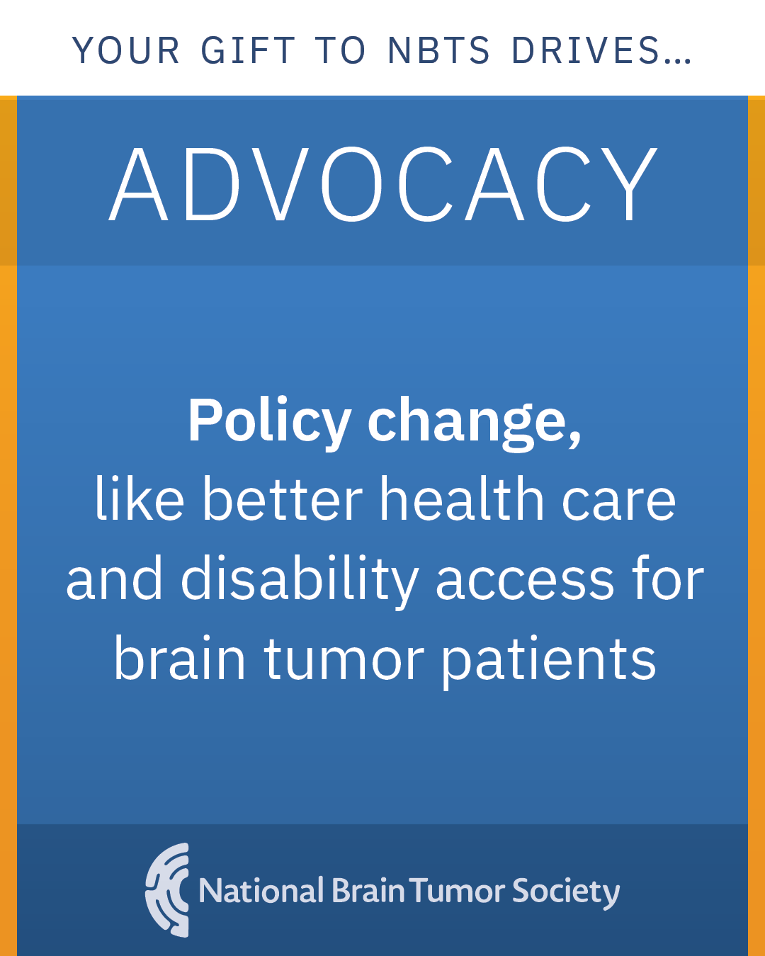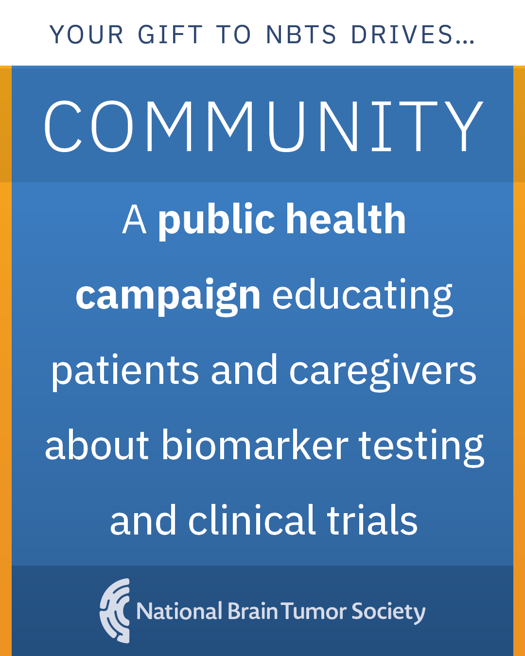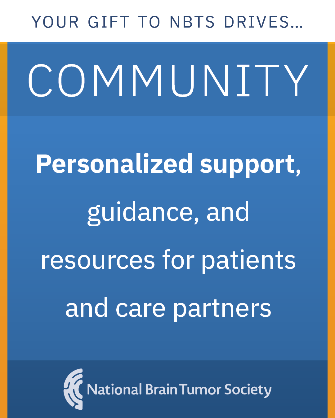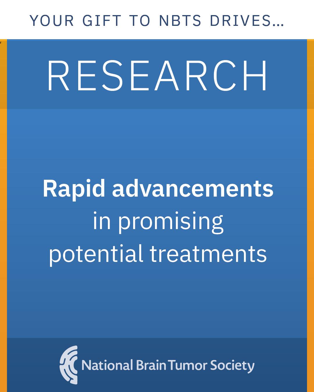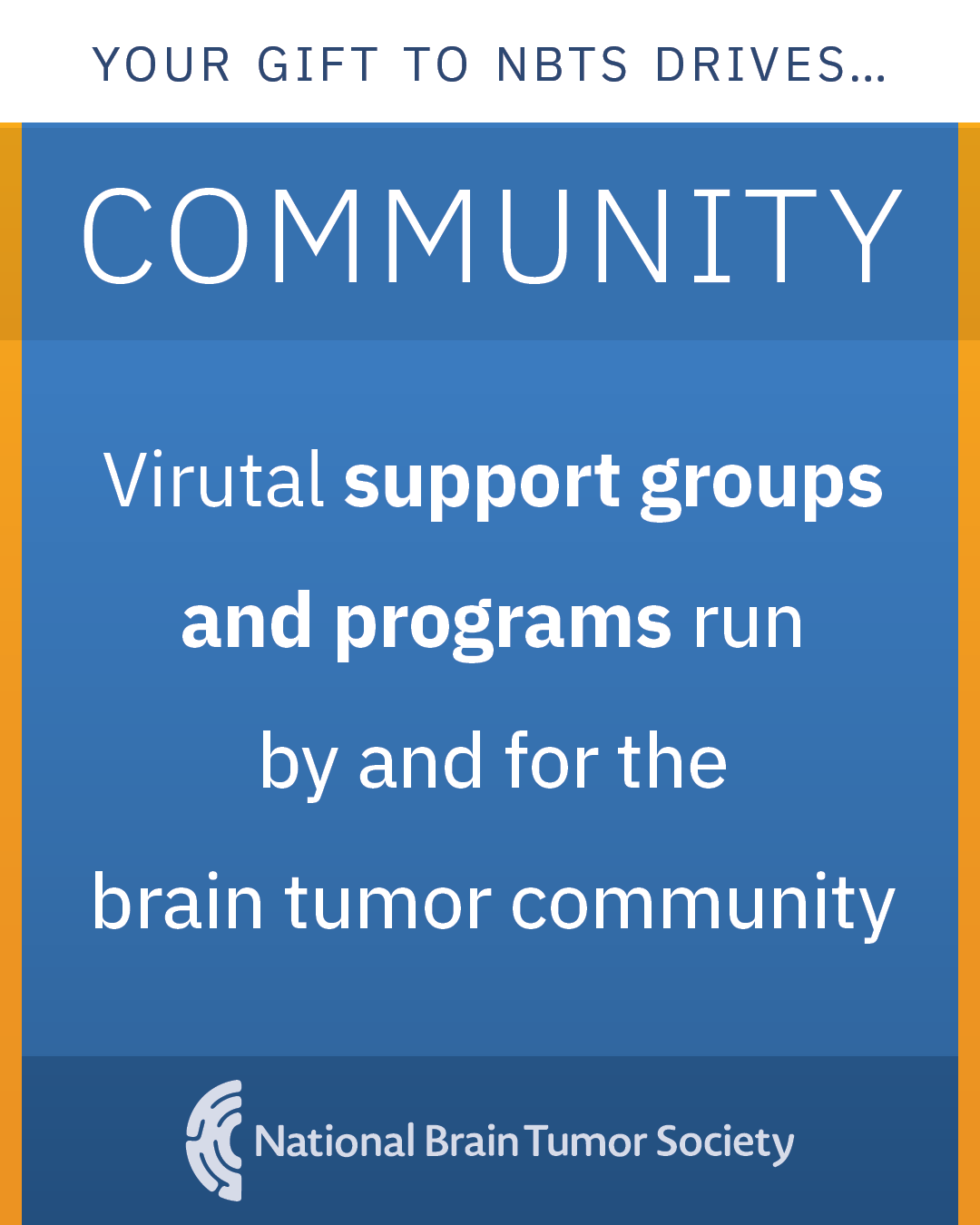 • No one should have to face this disease alone. No matter where you are in your brain tumor experience, the National Brain Tumor Society is there. From offering patient navigation and support groups to hosting advocacy and fundraising events, NBTS supports and unites the brain tumor community all year round. Make a gift today to champion the breakthroughs of tomorrow: https://braintumor.org/breakthroughsahead